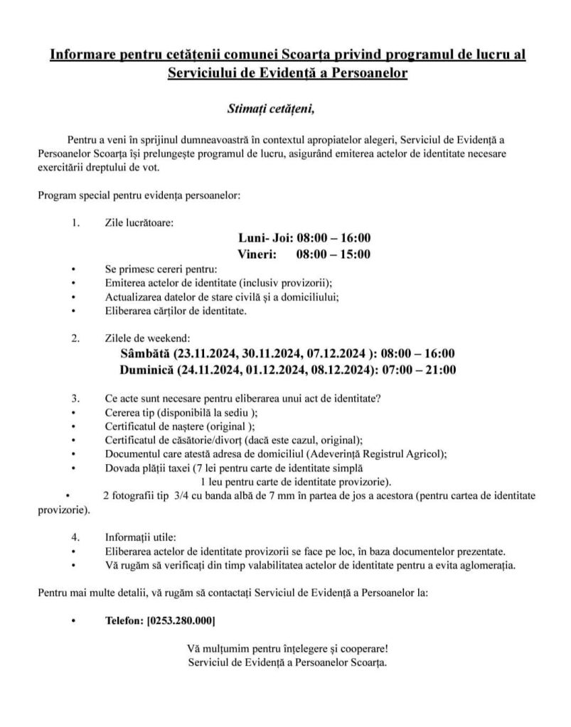 Primăria comunei Scoarța a publica programul de lucru al Serviciului de evidență a persoanelor.