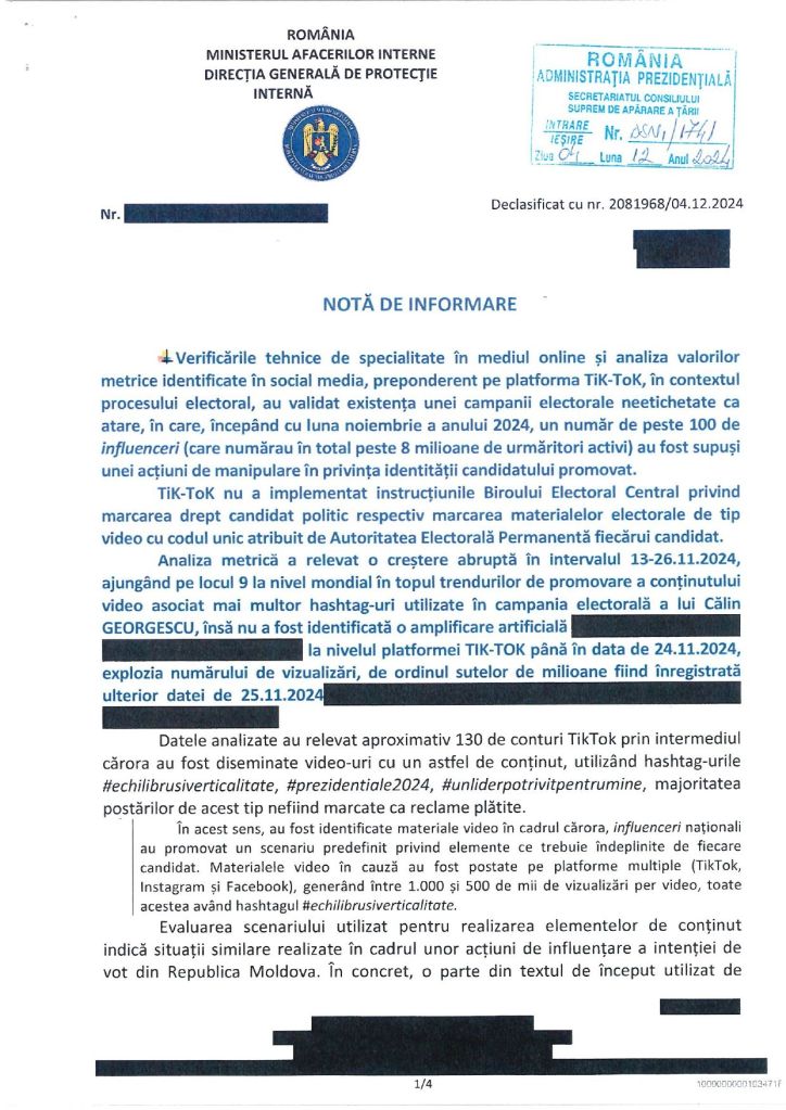 Președintele Klaus Iohannis a aprobat desecretizarea rapoartelor SRI, SIE și MAI, care dezvăluie implicarea Federației Ruse în alegerile prezidențiale din România. Documentele indică tehnici avansate de propagandă, manipulare online și atacuri cibernetice coordonate pentru susținerea candidaților proruși, inclusiv ascensiunea lui Călin Georgescu. Rusia consideră România un stat inamic și folosește metode sofisticate pentru influențarea opiniei publice și destabilizarea țării.