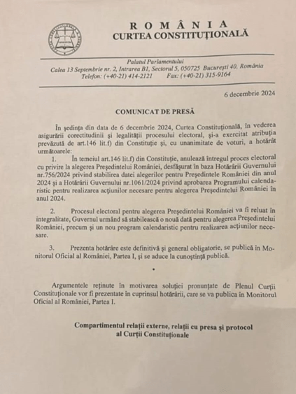Curtea Constituțională a României (CCR) a luat o decizie fără precedent, anulând în unanimitate primul tur al alegerilor prezidențiale. Conform comunicatului oficial, procesul electoral va fi reluat de la început, iar candidații trebuie să se reînscrie și să fie validați din nou de Biroul Electoral Central. Guvernul va stabili o nouă dată pentru scrutin.
