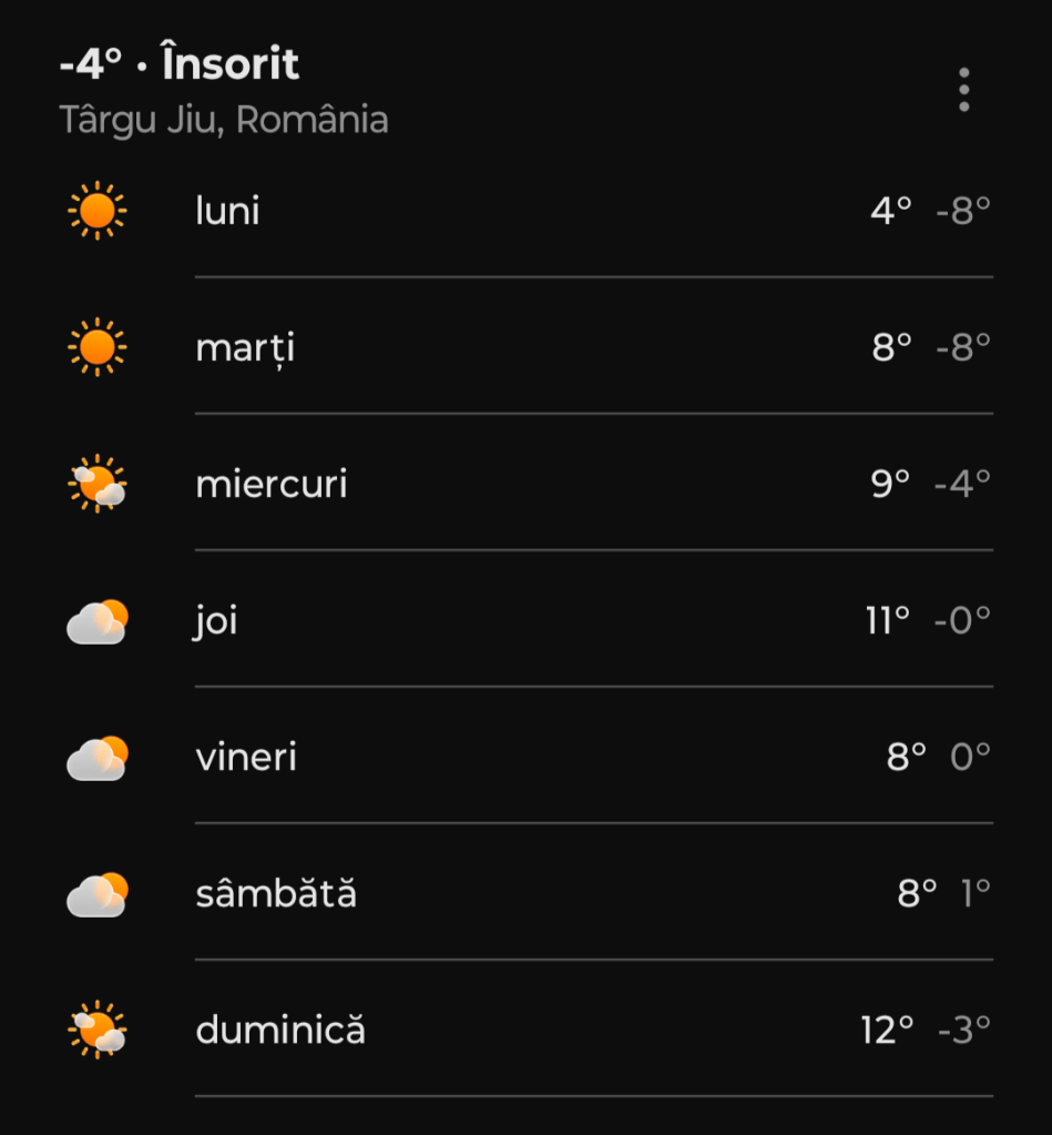 În săptămâna 24 februarie – 2 martie 2025, Târgu Jiu va experimenta o creștere treptată a temperaturilor, începând cu valori minime sub zero și ajungând la maxime de până la 12°C.