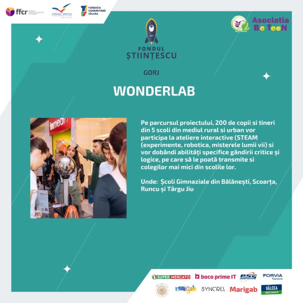 Asociația Be Teen anunță lansarea proiectului WonderLab, o inițiativă inovatoare destinată stimulării gândirii logice și a învățării interactive în rândul elevilor cu vârste cuprinse între 6 și 14 ani, din mediul rural și urban. Proiectul este finanțat de Fondul Științescu Vâlcea, fond gestionat în județul Gorj de Fundația Comunitară Vâlcea.