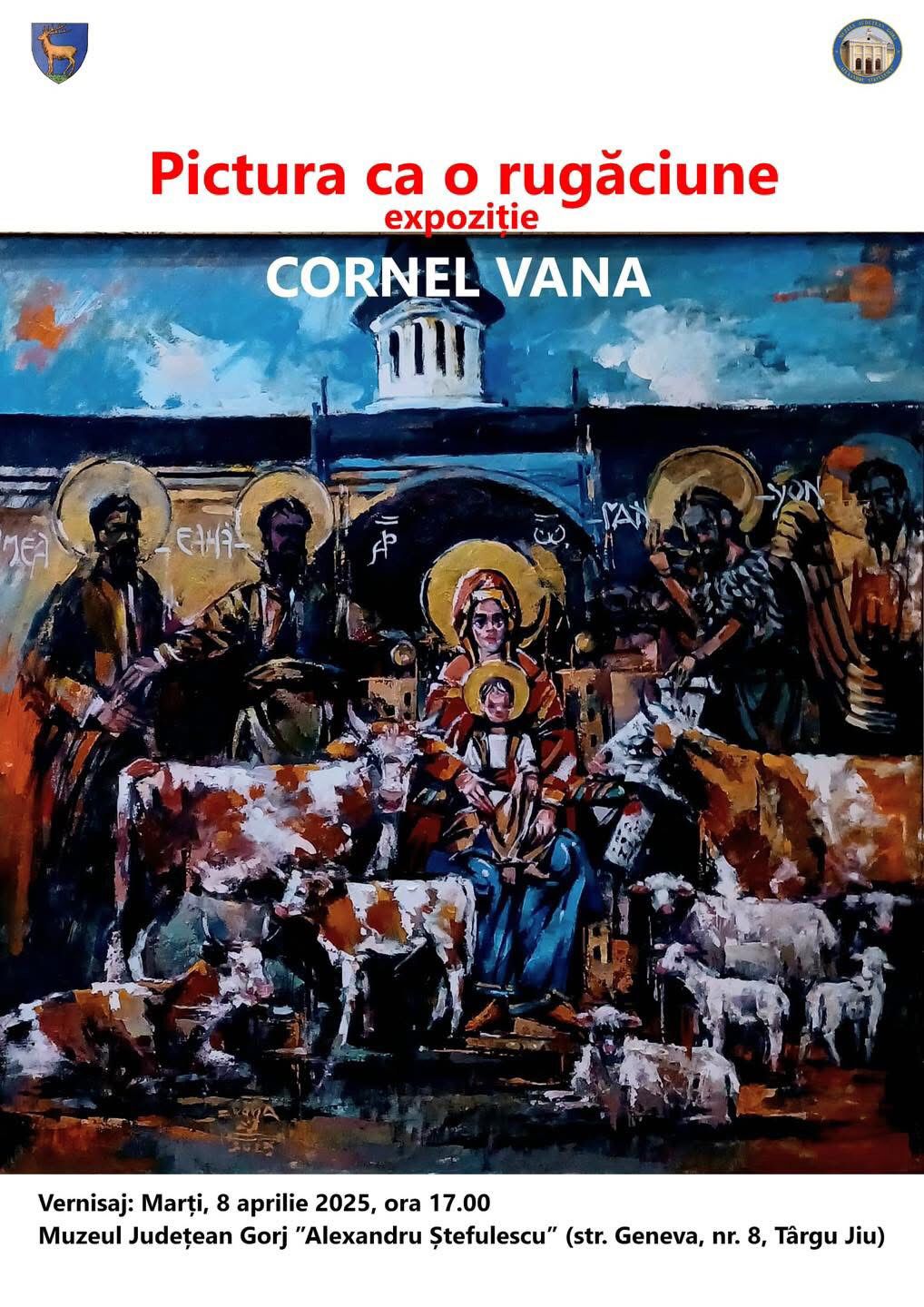 Marți, 8 aprilie 2025, de la ora 17.00, Muzeul Județean Gorj „Alexandru Ștefulescu” (strada Geneva, nr. 8) din Târgu Jiu găzduiește vernisajul expoziției „Pictura ca o rugăciune”. Artistul Cornel Vana propune publicului o incursiune în lumea satului tradițional românesc, unde fiecare element al vieții este în strânsă comuniune cu Dumnezeu. Lucrările sale sunt încărcate de un profund sentiment de uimire și recunoștință față de Creație, pictura devenind astfel o formă de rugăciune adresată Cerului.