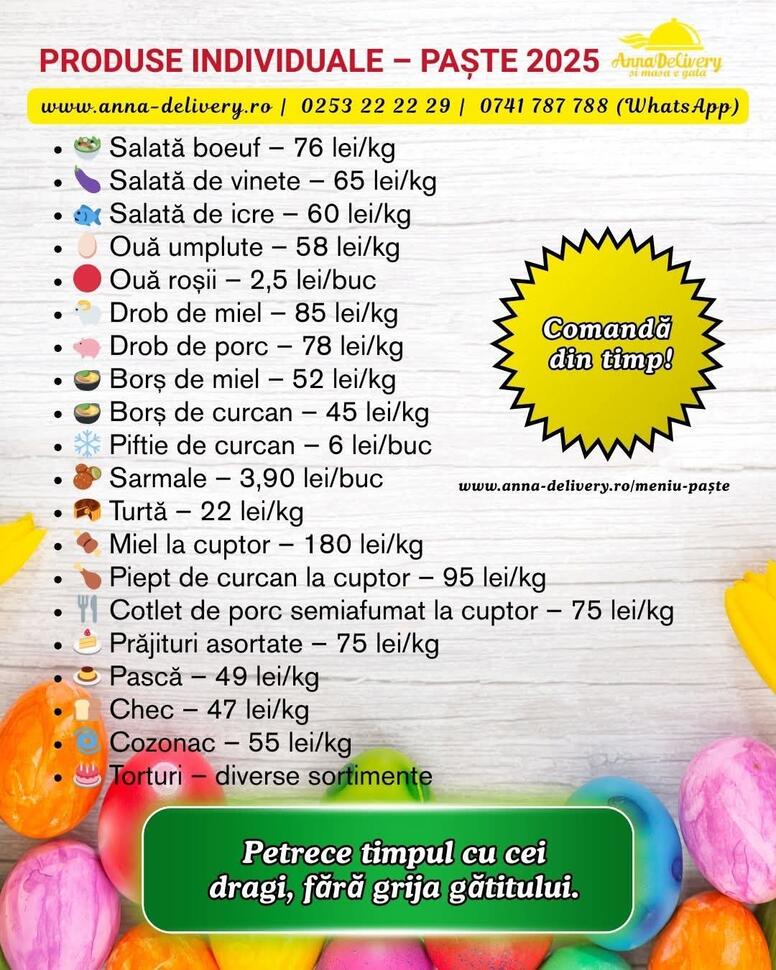 Pentru cei care își doresc să se bucure de preparate tradiționale fără efort, oferta Anna Delivery reprezintă o soluție practică și accesibilă în prag de Paște.