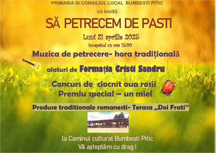 Luni, 21 aprilie, începând cu ora 15:00, locuitorii din Bumbești Pițic sunt așteptați să participe la o petrecere organizată în centrul comunei. Evenimentul este dedicat sărbătorii Învierii și vine cu momente de distracție, dar și cu ocazia de a socializa și a celebra împreună.
