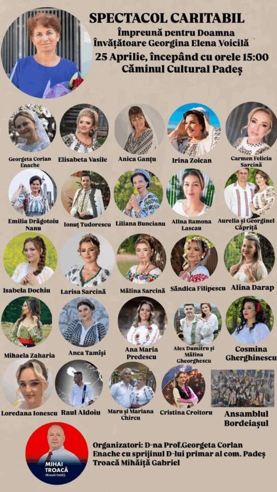Comunitatea din Padeș se adună într-un gest de solidaritate și recunoștință, pentru a-i fi alături uneia dintre cele mai îndrăgite cadre didactice ale comunei. Sub titlul „Pentru o inimă care a crescut generații – Hai să fim împreună pentru Doamna Învățătoare Georgiana Elena Voicilă”, spectacolul caritabil promite momente emoționante și o mobilizare exemplară.