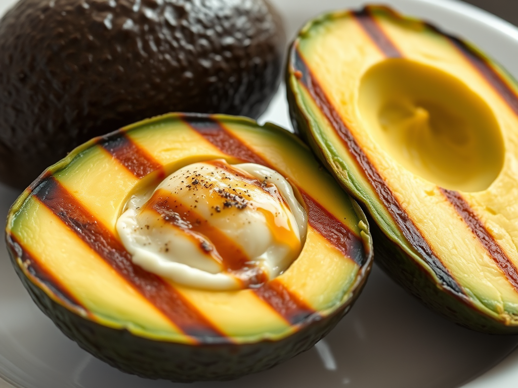 Tăiat pe jumătate, fără sâmbure, și pus direct pe grătar, avocado devine cremos și capătă o aromă de fum. Se poate umple cu brânză sau ou.