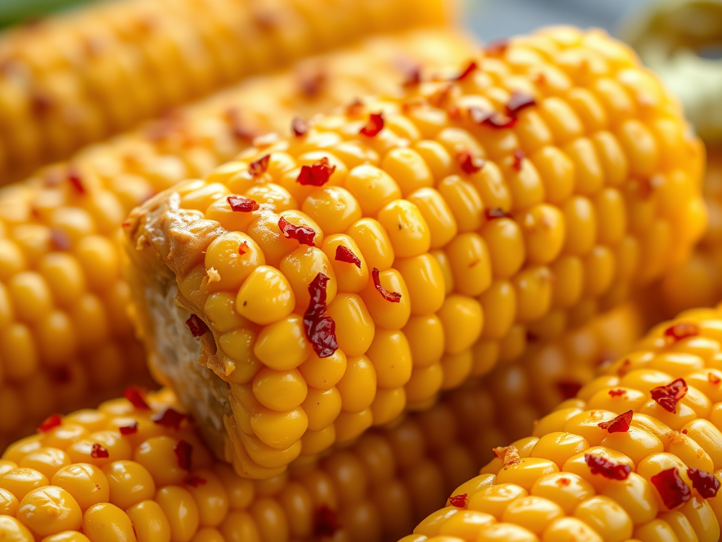 După ce este copt, porumbul se unge cu unt de arahide și se presară cu fulgi de ardei iute. Un contrast dulce-sărat complet inedit.