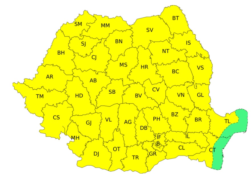 România intră sub incidența unui Cod galben de fenomene meteo extreme, care va fi valabil de vineri, ora 10:00, până sâmbătă, 24 mai, la ora 6:00. În acest interval, meteorologii avertizează asupra apariției de averse torențiale, descărcări electrice frecvente, intensificări de vânt cu rafale de 50 – 70 km/h, vijelii și grindină.