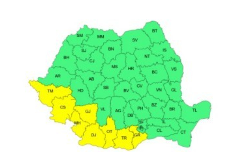 Administrația Națională de Meteorologie a emis o atenționare Cod galben pentru ziua de miercuri, vizând temperaturi deosebit de ridicate în județele Timiș, Caraș-Severin, Mehedinți, Gorj, Dolj, Olt, Teleorman și Giurgiu. Valorile termice vor atinge 36 de grade Celsius în unele localități, în special în Banat, sud-vestul Munteniei și cea mai mare parte a Olteniei.