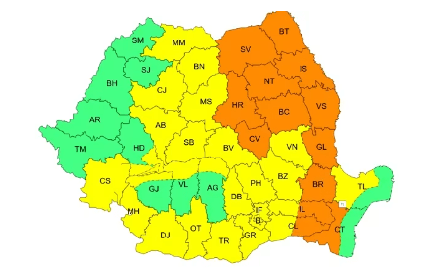 Administrația Națională de Meteorologie a emis o avertizare Cod portocaliu de instabilitate atmosferică severă, valabilă astăzi până la ora 22:00. Vizate sunt 13 județe din nord-est, est și sud-estul țării. În paralel, o avertizare Cod galben este în vigoare până joi, ora 02:00, pentru majoritatea regiunilor.