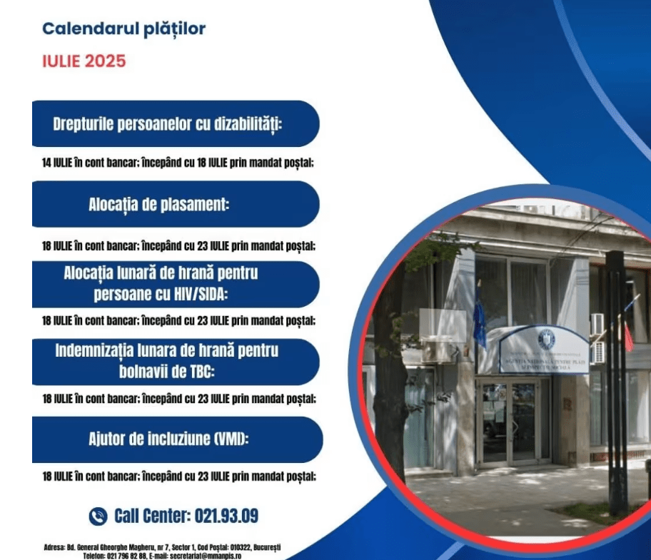 Agenția Națională pentru Plăți și Inspecție Socială (ANPIS) a publicat programul oficial pentru virarea beneficiilor sociale aferente lunii iulie 2025. Sumele vor fi distribuite etapizat, în funcție de categorie, fie prin cont bancar, fie prin mandat poștal.