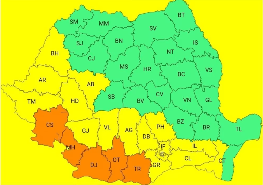 În paralel, pentru județele Caraș-Severin, Mehedinți, Dolj, Olt și Teleorman a fost emis cod portocaliu de caniculă.