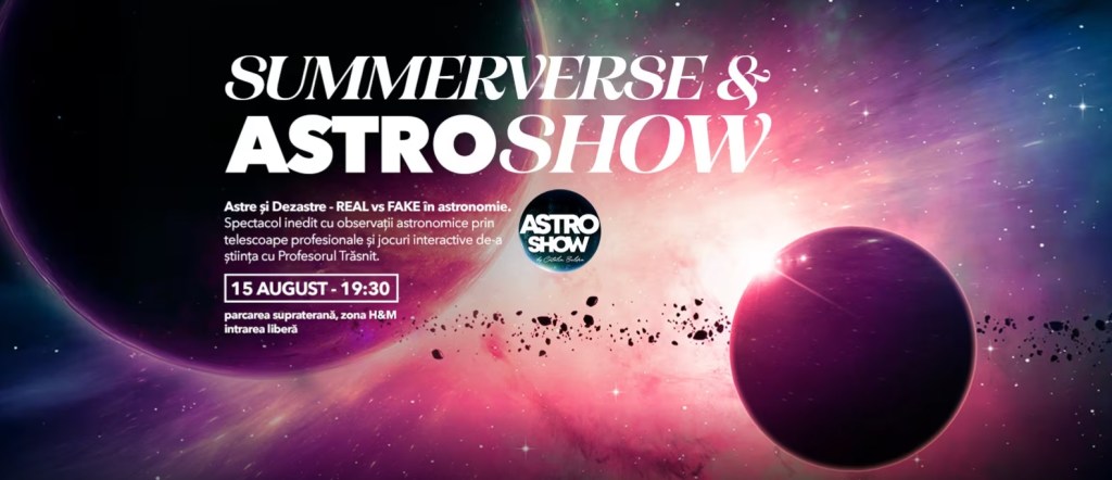 Evenimentul ASTROSHOW aduce o ediție specială sub tema „Astre și Dezastre: Real vs Fake în astronomie”, în cadrul căreia Profesorul Trăsnit va susține un show educativ și plin de umor. Publicul va fi invitat să descopere diferența dintre realitate și mit atunci când vine vorba despre Univers, într-o prezentare interactivă și accesibilă.