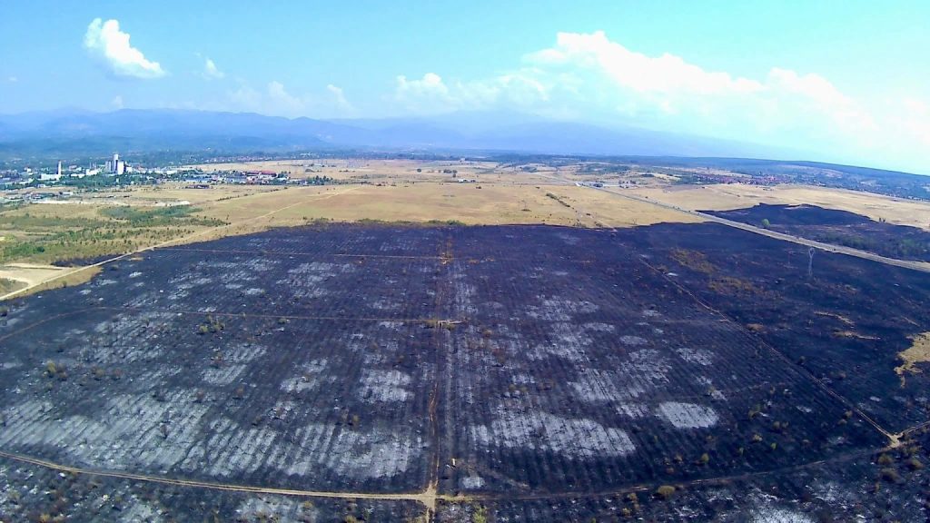 Imaginile surprinse de o dronă și difuzate în presa locală dezvăluie un peisaj dramatic: câmpuri întregi carbonizate, vegetație arsă și urme adânci lăsate de foc.