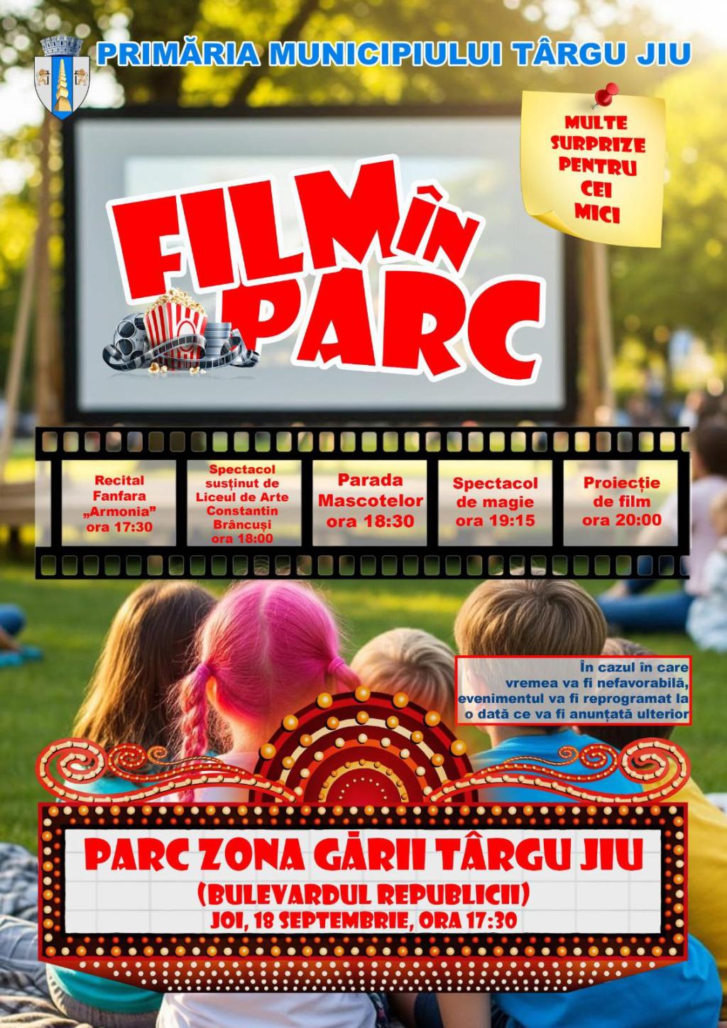 Primăria Târgu Jiu organizează joi, 18 septembrie, o nouă ediție a evenimentului „Film în parc”. Activitatea va avea loc începând cu ora 17:30, în parcul din zona Gării, pe Bulevardul Republicii.