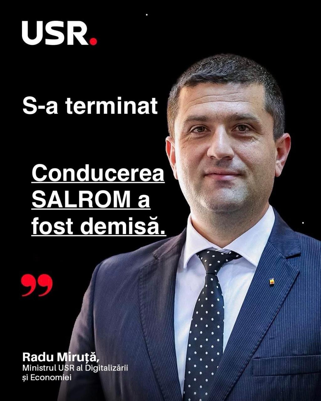„A durat, dar s-a întâmplat, indiferent cât au vrut unii să pună piedici. Conducerea Salrom a fost demisă. Mai și închidem astfel din fronturile deschise. S-a terminat cu nepăsarea și aroganța celor care cred că resursele statului român sunt moștenire personală!”, a transmis ministrul, precizând că decizia a fost luată prin vot, împreună cu acționarul minoritar al companiei.