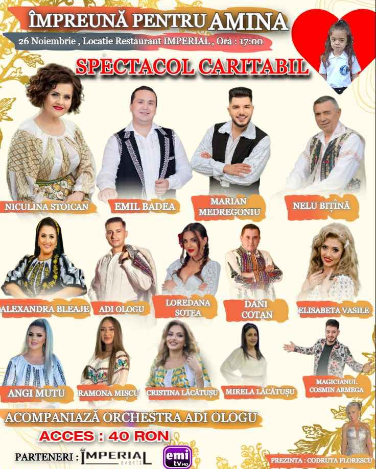 Evenimentul caritabil, intitulat „Împreună pentru Amina”, va avea loc pe 26 noiembrie, de la ora 17:00, la Restaurantul Imperial din Târgu Jiu. Prețul unui bilet este de 40 de lei, iar toate fondurile obținute vor fi direcționate către tratamentul micuței.