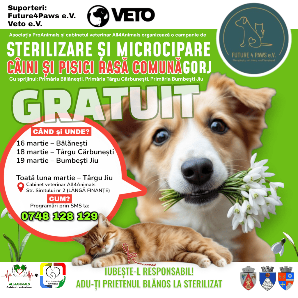 Asociația Pro Animals dă startul campaniilor de sterilizare și microcipare gratuită pentru câini și pisici de rasă comună. Acțiunile se vor desfășura pe teren, în mai multe localități din județul Gorj, pe tot parcursul lunii martie. Programările se fac exclusiv telefonic.